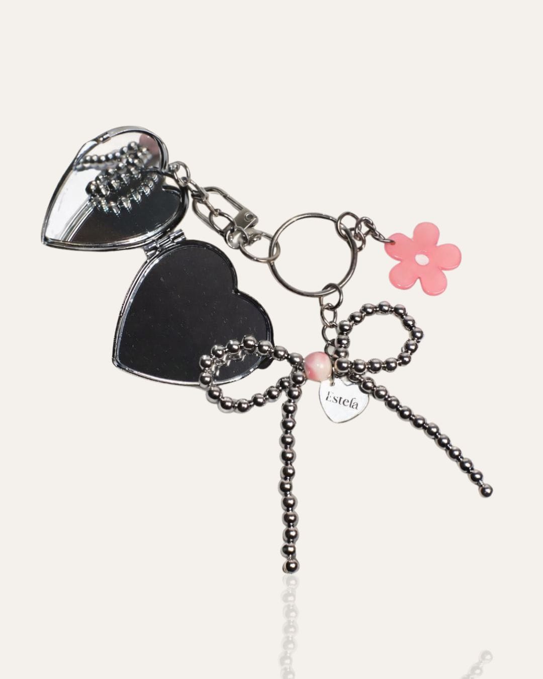 Keychain with pearl bow and heart mirror charm